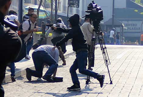 ▲ Momento en el que un sujeto dispara contra dirigentes de comerciantes ambulantes del Centro Histórico de Cuernavaca, quienes habían sostenido una reunión de trabajo con autoridades locales sobre el reordenamiento de esa actividad. El ataque ocurrió a un lado del palacio de gobierno. El agresor fue perseguido y finalmente detenido. Foto Margarito Pérez/ La Jornada Morelos