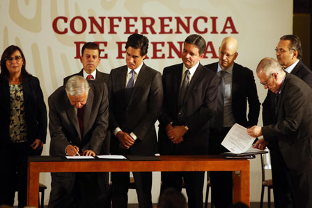 ▲ El presidente Andrés Manuel López Obrador, acompañado por integrantes de su gabinete y de los directivos de HSBC, JP Morgan y Mizuho Securities, firma el acuerdo que logró Pemex con las tres instituciones financieras internacionales para acceder a un fondo revolvente que le permitirá refinanciar su deuda con una tasa competitiva de 4.85 por ciento. El mandatario puntualizó que la confianza de estos consorcios debe modificar la percepción que tienen calificadoras sobre la petrolera nacional. Foto Jesús Villaseca