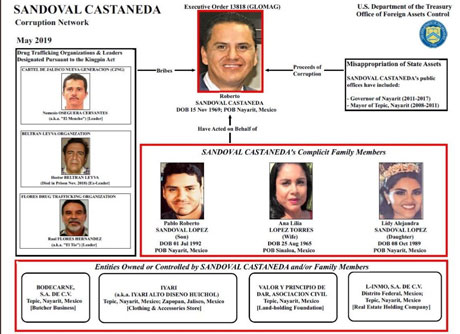 ▲ Infografía divulgada por el Departamento del Tesoro sobre los vínculos de Roberto Sandoval Castañeda y su familia con el cártel Jalisco Nueva Generación, uno de los principales grupos criminales del país.