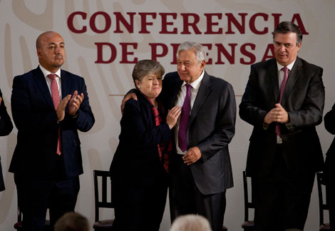 ▲ El presidente Andrés Manuel López Obrador felicita a Alicia Bárcena, titular de la Comisión Económica para América Latina y el Caribe, luego de que ésta presentó el Plan de Desarrollo Integral para El Salvador, Guatemala, Honduras y México. Sostuvo que en la fórmula contra la crisis migratoria regional se debe colocar al desarrollo económico en el centro de la solución. Foto Cristina Rodríguez