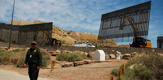 ▲ Con ayuda de grúas, veteranos de guerra comenzaron este fin de semana la construcción de una valla de 800 metros con barrotes de acero en el punto donde se unen Texas y Nuevo México, frente a Ciudad Juárez, Chihuahua.