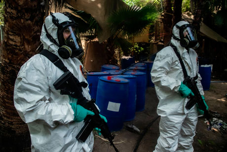 ▲ La Secretaría de Marina y la Policía Estatal Preventiva descubrieron ayer las plantas clandestinas de metanfetaminas, ubicadas en el municipio de Culiacán. Fueron incautados 17 mil litros de precursores para drogas sintéticas; no hubo detenidos. Foto Afp