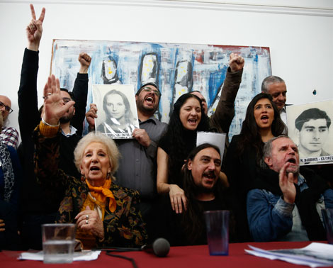 ▲ Javier Matías Darroux Mijalchuk (centro), junto con su tío biológico, Roberto Mijalchuk, y Estela de Carlotto, presidenta de esa organización, lanzan porras durante la conferencia en Buenos Aires. La restitución de mi identidad es un homenaje a mis padres y una caricia al alma, dijo Javier Matías, quien fue secuestrado cuando era un bebé durante la dictadura argentina. Foto Ap.