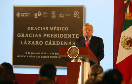 ▲ Ante sobrevivientes del exilio republicano español, el presidente Andrés Manuel López Obrador expresó que México siempre tratará con respeto y dará protección a los migrantes. Irene Lozano Domingo, secretaria de Estado de la España Global, compartió al mandatario un mensaje de amistad, gratitud y reconocimiento por ese acto, al recordar que el general Cárdenas no titubeó y proclamó su voluntad de acoger a todos los que huían del dolor, la cárcel, la persecución. Les ofreció una nueva patria y con ello una nueva vida. Foto Jesús Villaseca