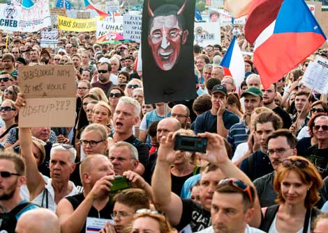▲ Unas 250 mil personas se movilizaron ayer en Praga para exigir la renuncia del primer ministro, Andrej Babis, por sospecha de fraude. Fue la mayor movilización desde la caída del comunismo hace 30 años. No estamos haciendo una revolución, pero queremos retomar los legados de 1989, dijo uno de los líderes de la organización Un Millón de Momentos por la Democracia. Foto Afp