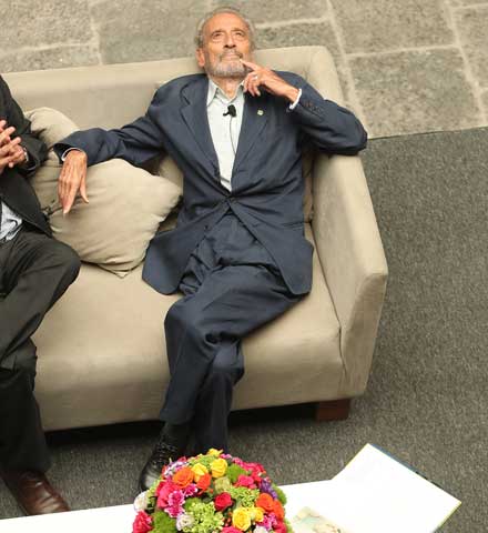 ▲ Ayer fue inaugurado el vitral en la casa matriz del Nacional Monte de Piedad. El artista plástico, y diseñador original de La Jornada, sentado en un sillón ubicado en una plataforma en el patio central, pidió: