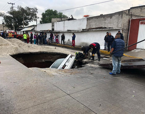 ▲ Dos vehículos y sus ocupantes cayeron la mañana de ayer en un hueco de unos ocho metros de diámetro y tres de profundidad que se formó el jueves al paso de un tractocamión que transportaba 40 toneladas de grava en la avenida Manuel Ávila Camacho, colonia El Chamizal, en Ecatepec, sin que resultaran personas lesionadas. Autoridades reconocieron que hay unos 120 socavones en la demarcación mexiquense. Foto La Jornada.
