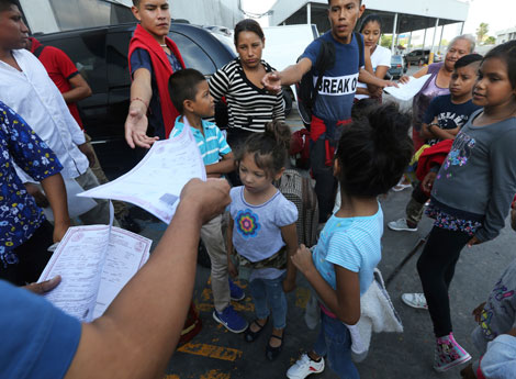 ▲ El Pentágono anunció que aprobó el pedido en respaldo a las últimas medidas del presidente estadunidense para endurecer las reglas de asilo. En Tamaulipas, Nuevo León, Tabasco y Chiapas se informó ayer de la detención de 484 migrantes, en su mayoría centroamericanos. En la imagen, un religioso, encargado de un centro de apoyo en Nuevo Laredo, reparte documentos a extranjeros antes de que ingresen a una oficina del INM para incluirse en una lista de solicitantes de refugio en Estados Unidos. Foto Ap.
