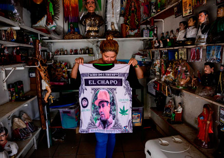 ▲ Una prenda con la imagen del capo del cártel de Sinaloa es ofrecida en una tienda de Culiacán junto con figuras de la Santa Muerte y de Jesús Malverde, patrono del narco. Un día antes de que fuera condenado en Nueva York fue lanzada en la Feria Intermoda, en la Expo Guadalajara, la línea de ropa El Chapo 701, la cual, trascendió, es propiedad de su hija Alejandrina. Foto Afp.