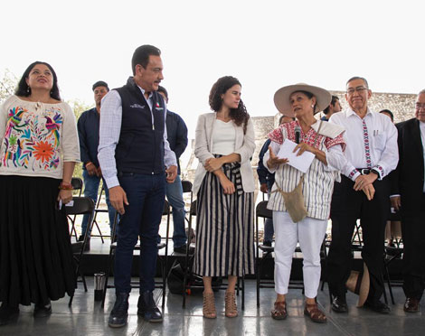 ▲ Los gobiernos federal y de Hidalgo presentaron ayer el programa Jóvenes Construyendo el Futuro, mediante el cual se rescatará el espacio prehispánico y se dará empleo en la localidad. La senadora Jesusa Rodríguez, principal impulsora de la idea, detalló cómo surgió la propuesta. Acudieron al acto las secretarias de Cultura, Alejandra Frausto, y del Trabajo y Previsión Social, Luisa María Alcalde, así como el mandatario Omar Fayad y su secretario de Gobierno, Simón Vargas. Foto Juan Ricardo Montoya.