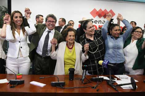 ▲ Mónica Fernández Balboa (de vestido negro y collar) celebra con correligionarios de Morena su designación para presidir el Senado. En primera votación, 33 legisladores sufragaron por cambiar la mesa directiva y 29 votaron en favor de la relección de Martí Batres. Había cuatro aspirantes, pero tres declinaron por la ahora dirigente. Foto María Luisa Severiano
