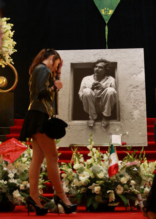 ▲ En honor a Francisco Toledo, quien el jueves pasado murió a los 79 años, habitantes de la Ciudad de México y admiradores acudieron ayer al recinto cultural, donde se montó una ofrenda floral dedicada al artista juchiteco, en la que sobresale la foto que le tomó Graciela Iturbide. Este sábado continuará de las 10 a las 21 horas. Foto Luis Castillo