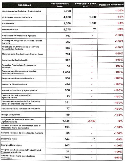 Entre los temas que les preocupan están el recorte a numerosos programas: “Necesitamos programas sociales, pero también programas productivos. Damos la bienvenida a los programas sociales que contribuyen a superar las condiciones de pobreza y marginación. No obstante, es necesario fortalecer esquemas de inclusión productiva. Por ello, resulta grave la drástica reducción que se propone a los programas con impacto productivo operados a través de la Secretaría de Agricultura y Desarrollo Rural, cuyo presupuesto se reduce de 65,434.9 mdp en 2019 a 46,253.1 mdp en el PPEF 2020, lo que significa una disminución de 29.3%. De no corregirse esta propuesta, el país enfrentará una pronunciada caída de la producción agropecuaria y un marcado desequilibrio en la balanza comercial agropecuaria, así como, una disminución en los ingresos de los productores rurales, además de deteriorar las condiciones de vida y estabilidad social en el medio rural. Agregan que “No se rescata al campo eliminando los programas productivos. Respaldamos el propósito expresado en el PND, cuando se afirma que el gobierno federal se ha propuesto como uno de sus objetivos romper el “círculo vicioso entre postración del campo y dependencia alimentaria” y por ende impulsar la autosuficiencia alimentaria y el rescate del campo. Eliminar o reducir los Programas Productivos resulta contrario al PND y los compromisos asumidos por el Presidente de la República”. Las organizaciones dicen estar de acuerdo con “otorgar la mayor prioridad al bienestar social y al combate a la pobreza. Seis de cada diez mexicanos que viven en el medio rural enfrentan condiciones de pobreza”. En lo que se refiere al combate a la corrupción, dicen estar de acuerdo en “promover la austeridad y entregar los recursos del campo de manera directa y sin intermediarios a los productores rurales. ‘…Que se ajusten los mecanismos, no los presupuestos…’”. Subrayan que para tener finanzas sanas que impulsen el crecimiento “es indispensable realizar importantes ajustes que fortalezcan la reactivación económica, el mercado interno y el empleo, lo que exige incrementar el presupuesto de los programas productivos del campo”. Subrayan que coinciden en que “el Estado mexicano debe recuperar su fortaleza… Por eso, nos resulta preocupante que en el PPEF 2020 se ajuste drásticamente el Presupuesto para el Campo porque ello significa el riesgo de pasar de un Estado mínimo a un Estado ausente y generador de pobreza”. Añaden que en el campo mexicano vive el 25% de la población y al campo solo se le asigna el 5.4% del gasto total. Acerca de la migración de población rural, las confederaciones dicen que es necesario “generar las condiciones económicas y sociales que permitan arraigar a la población en su tierra. En el campo eso se logra con esquemas de financiamiento, asistencia técnica, capacitación y apoyos al cultivo, producción y comercialización, medidas sanitarias y esquemas de aseguramiento, mismos que se ven afectados en la propuesta presupuestal. Un campo trabajando reconstituye el tejido social”. Advierten que el campo enfrenta riesgos, entre ellos el de cambio climático, por lo que llaman a no escatimar recursos para su prevención, pues “están en juegos las condiciones de vida de millones de campesinos, pero también la producción y el abasto de productos básicos para la población”. •