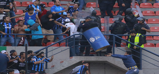 ▲ Las barras de ambos equipos se enfrentaron a golpes y se lanzaron objetos en las gradas del estadio Alfonso Lastras, sin que las escasas fuerzas de seguridad pudieran contenerlos. La batalla comenzó cuando faltaban cinco minutos para el final del juego, que ganaron los Gallos por 0-2 goles. El árbitro Óscar Mejía decidió suspender el juego, por lo que el recinto está en riesgo de veto para el cotejo contra América. Algunos aficionados resultaron heridos, pero no se dio a conocer la cifra oficial. Foto Jam Media.