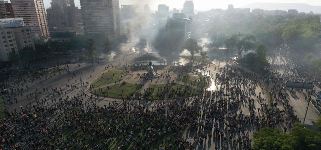 ▲ La capital chilena volvió a convertirse en campo de batalla, cuando las fuerzas gubernamentales lanzaron gases lacrimógenos y utilizaron tanques de agua contra manifestantes que marchaban de manera pacífica por la Plaza Italia. Al caer la noche, miles desafiaron el toque de queda en Santiago y otras ciudades, en las cuales realizaron