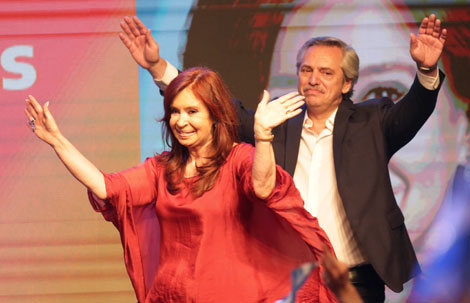 ▲ Alberto Fernández y Cristina Fernández de Kirchner, presidente y vicepresidenta electos de Argentina, celebran en Buenos Aires con sus simpatizantes el triunfo holgado que alcanzó el Frente de Todos en las elecciones generales realizadas ayer. El mandatario Mauricio Macri, quien intentaba relegirse para un segundo periodo, reconoció su derrota y aseguró que deja un país