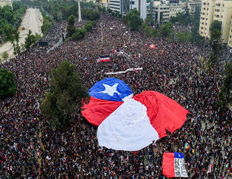 ▲ Una multitudinaria marcha pacífica rebautizó la Plaza de Italia con el nombre de Plaza de la Dignidad, en Santiago, donde el ondear de las banderas chilenas y las consignas contra el gobierno de Sebastián Piñera relucieron como en movilizaciones anteriores. La protesta de ayer derivó en incendios y saqueos, como en la sede de la Universidad Pedro de Valdivia, al tiempo que la ONU condenó el excesivo uso de la fuerza policiaca contra la población. El Congreso aprobó reducir de 45 a 40 horas la jornada laboral. Foto Afp. Agencias