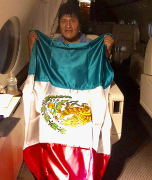 Ya despegó la nave de la Fuerza Aérea Mexicana. De acuerdo con las convenciones internacionales está bajo nuestra protección. Su vida e integridad están a salvo, y acompañó el mensaje con una fotografía del ex presidente de Bolivia con una bandera nacional.