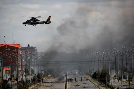 ▲ Militares usaron helicópteros, vehículos blindados y gases contra simpatizantes del exiliado presidente Evo Morales, quienes bloqueaban un depósito de combustible en El Alto; el saldo fue de tres muertos y 30 heridos. En La Paz se realizó nueva marcha para exigir que renuncie la autoproclamada presidenta Jeanine Áñez. Desde México, el líder aymara emitió un mensaje al pueblo boliviano: ‘‘Este es un gobierno de facto, no de transición, que reprime y mata. Es tiempo de dictadura y debemos mantenernos unidos’’. Foto Ap. Arturo Cano, enviado