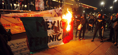 ▲ Grupos de embozadas se incrustaron en la movilización por el Día Internacional de la Eliminación de la Violencia contra la Mujer, los cuales hicieron destrozos en cinco estaciones del Metrobús y realizaron pintas en monumentos de Paseo de la Reforma y avenida Juárez. En el Zócalo quemaron una bandera y pancartas. Autoridades reportaron dos lesionados. Foto Cristina Rodríguez