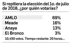 Si se repitiera la elección del primero de julio de 2018, ¿por quién votarías? Un rápido sondeo (ver gráfica) realizado ayer a través de Twitter, en el que participaron 10 mil 450 personas, indica que 69 por ciento volvería a votar por AMLO, 16 por ciento por Meade, 13 por ciento por Anaya y sólo 3 por ciento por El Bronco Rodríguez. Un dato puede servir de referencia: de los 56 millones 611,027 ciudadanos que votaron en las elecciones federales, 53.19% lo hicieron por Andrés Manuel López Obrador. El sondeo fue interrumpido antes del tiempo previsto por una invasión de bots.