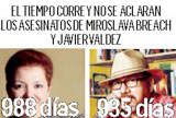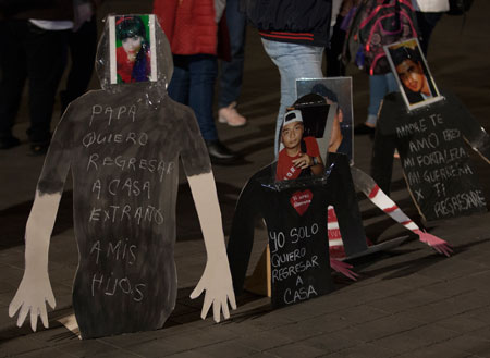 ▲ Los manifestantes colocaron mantas con las fotografías de sus seres queridos, así como siluetas de cartón, frente a Palacio Nacional para denunciar la falta de avance en sus casos. Denunciaron que tuvieron que suspender búsquedas en Jalisco, luego de que las autoridades estatales no les garantizaron un equipo de seguridad para protegerlos. Foto Cristina Rodríguez./Fernando Camacho