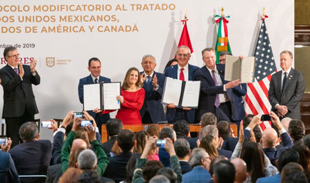 ▲ Chrystia Freeland, viceprimera ministra de Canadá; Jesús Seade, subsecretario para América del Norte de la cancillería, y Robert Lighthizer, representante de la Oficina Comercial de Estados Unidos, sostienen el documento del protocolo modificatorio del T-MEC. Atestigua el presidente Andrés Manuel López Obrador, en el acto realizado en Palacio Nacional. Los cambios se centran en mecanismos para resolver disputas laborales, patentes para medicamentos y la fabricación regional de acero. Foto Pablo Ramos