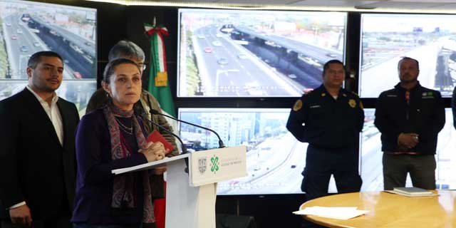 ▲ Claudia Sheinbaum, jefa de Gobierno de la Ciudad de México, explica en conferencia los alcances del programa de vigilancia policiaca en esta época decembrina. Omar García Harfuch (atrás de la mandataria), secretario de Seguridad Ciudadana, señaló que habrá otras acciones para las festividades de Año Nuevo y Día de Reyes. Foto Jesús Villaseca