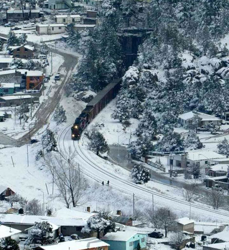 ▲ Veinticinco de los 67 municipios de Chihuahua registraron al amanecer temperaturas de hasta menos 12 grados; en 12 demarcaciones nevó y se formaron capas de 10 centímetros de espesor. La Unidad Estatal de Protección Civil alertó a la población a tomar precauciones ante los recientes casos de muertes por hipotermia o inhalación de monóxido de carbono. El frío también afecta a Durango. En las poblaciones serranas de La Rosilla y Navíos se llegó a las temperaturas más bajas (–14 y –13 grados). En la imagen, paso del ferrocarril por Creel, municipio de Bocoyna, Chihuahua. Foto La Jornada. / Rubén Villalpando, corresponsal