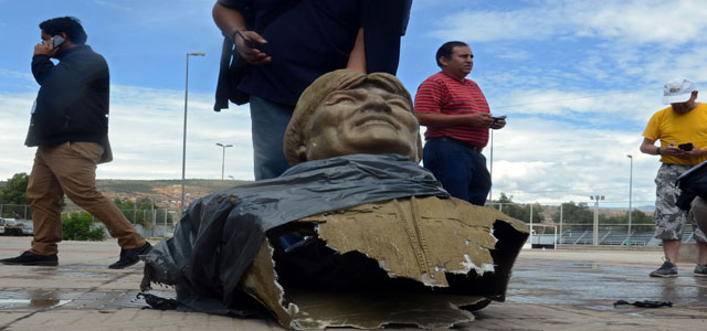 ▲ Luis Fernando López, ministro de Defensa del gobierno de facto, rechazó la lógica terrorista y sediciosa del ex presidente boliviano, quien dijo: si volviera organizaría milicias armadas del pueblo, como en Venezuela, y reiteró que sufrió un golpe de Estado. En ese tenor, las autoridades golpistas derribaron un busto de Evo Morales de un polideportivo en Cochabamba. Foto Afp. Agencias