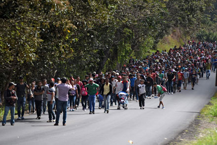 ▲ La nueva caravana de migrantes hondureños con destino a Estados Unidos transitó ayer por la localidad guatemalteca de Esquipulas. Horas antes, más de un millar de indocumentados evadieron controles y rompieron un cerco policial en el puesto fronterizo de Agua Caliente. Las autoridades vigilan que los niños estén acompañados por algún familiar. Foto Afp