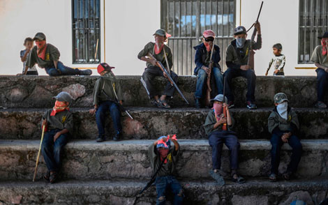 ▲ A una semana del asesinato de diez integrantes de la Coordinadora Regional de Autoridades Comunitarias-Pueblos Fundadores (CRACPF), a raíz de lo cual los pobladores armaron a niños de entre seis y 15 años para que apoyen en la defensa de sus comunidades en la Montaña Baja de Guerrero, región que se disputan Los Ardillos y Los Rojos, el gobernador Héctor Astudillo visitó Alcozacan, donde firmó una minuta en la que se compromete a instalar retenes y vigilancia permanente para evitar la violencia. Los pobladores levantarán el bloqueo carretero que pusieron el día de los crímenes. La imagen, parte de un amplio reportaje sobre el tema difundido ayer por Afp. Sergio Ocampo