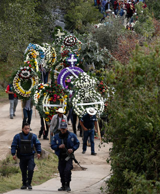 ▲ Cientos de michoacanos de los ejidos de El Rosario y San Luis, municipio de Ocampo, acudieron ayer al sepelio de Homero Gómez González, principal promotor del turismo en el santuario El Campanario, quien el 13 de enero desapareció de la pequeña población de El Soldado y el 29 campesinos lo hallaron en un pozo. Las autoridades estatales dijeron que el activista de 52 años murió ahogado y tenía un golpe en la cabeza. Foto Ap / Ernesto Martínez Elorriaga, corresponsal