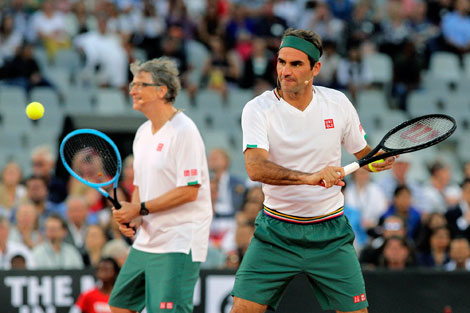 ▲ Las leyendas del tenis Roger Federer y Rafael Nadal reunieron a 51 mil 954 espectadores en un partido benéfico disputado en el estadio Cape Town de Ciudad del Cabo, como parte del evento organizado por la Fundación Roger Federer. Antes del duelo entre los gigantes suizo y español se jugó un dobles con el empresario informático Bill Gates (izquierda) acompañando a Federer y el cómico sudafricano Trevor Noah a Nadal, en un ambiente festivo. El anterior récord fue de 42 mil 517 fans, en la Ciudad de México. Foto Ap. / Agencias