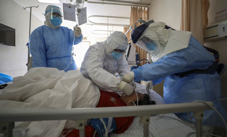 ▲ La epidemia en el país asiático, que ha causado hasta ayer mil 868 muertos y 72 mil 436 contagios, obligó a autoridades de provincias y ciudades a imponer cuarentenas y limitaciones de viaje en distintos grados, reveló un estudio. En Hubei, donde surgió el coronavirus, se anunciaron ayer nuevas medidas, que incluyen la prohibición total de desplazamientos con vehículo y el cierre de negocios no esenciales. En la imagen, atención a un infectado en un hospital de Wuhan. Foto Ap. Agencias