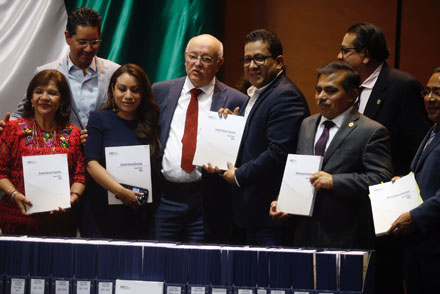 ▲ David Colmenares Páramo, titular de la Auditoría Superior de la Federación (centro), realizó ayer la tercera entrega a la Cámara de Diputados de Informes Individuales y el Informe General Ejecutivo del Resultado de la Fiscalización de la Cuenta Pública 2018. Señaló que gracias a la fiscalización de ese periodo se han recuperado 9 mil 808 millones de pesos del erario. Foto Guillermo Sologuren