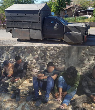▲ En dos operativos, elementos del Ejército, Guardia Nacional y policía de Guerrero detuvieron en Zirándaro a 18 hombres que los atacaron en un paraje, a quienes decomisaron fusiles AK-47 y AR-15, una granada y tres vehículos, uno con blindaje artesanal, simulando una tanqueta (arriba), así como una granada, cargadores y más de 4 mil cartuchos útiles. Fotos La Jornada.