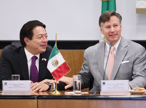 Christopher Landau, embajador de Estados Unidos, acudió ayer a ese recinto para atestiguar la integración del grupo legislativo de amistad entre ambos países. Enfatizó que hay tres temas de gran interés: delincuencia organizada, comercio y tráfico de personas. En la imagen lo acompaña Mario Delgado, presidente de la Junta de Coordinación Política, en San Lázaro. Foto La Jornada