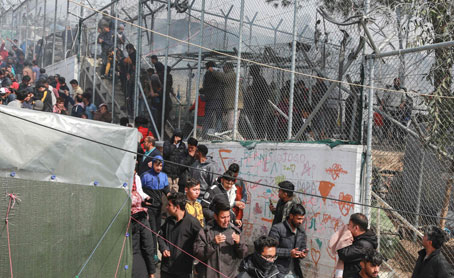 ▲ El espacio ubicado en Moira, en territorio griego, fue desalojado ayer luego del siniestro accidental en el que falleció una niña. Los bomberos tardaron cerca de una hora en controlarlo; el lugar fue construido para 5 mil personas, pero albergaba a 20 mil. En el puerto de Kea, cerca de Atenas, un petrolero con 190 migrantes quedó varado por el mal tiempo. Foto Afp. Agencias