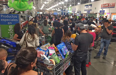 ▲ Pese a los llamados de las autoridades capitalinas para no efectuar compras de pánico por los casos de coronavirus, muchos centros comerciales se vieron abarrotados para la adquisición de víveres y productos de limpieza. El CCE afirmó, en comunicado, que los empresarios garantizan el abasto de alimentos y productos de primera necesidad en el país ante esta emergencia. Foto Cristina Rodríguez