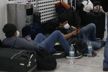 ▲ Decenas de pasajeros de varios estados se quedaron varados en la terminal debido a que aerolíneas suspendieron o cambiaron los itinerarios de vuelo sin previo aviso. Según empleados de algunas de las empresas, la baja afl uencia de usuarios por la epidemia del coronavirus ha obligado a tomar estas decisiones. Foto Yazmín Ortega Cortés. / César Arellano García