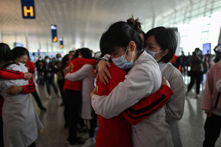 ▲ Médicos de la provincia de Jilin (de rojo), quienes trabajaron hombro con hombro con enfermeras de Wuhan durante dos meses en la emergencia por el coronavirus, se despiden en el recién abierto aeropuerto de esa localidad, la cual fue origen del Covid-19. Horas antes hubo una ceremonia que puso fin al férreo confinamiento decretado por autoridades chinas para contener la epidemia. Foto Afp