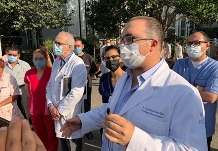 ▲ Alfredo Merino, director del Hospital 20 de Noviembre del Issste, se reunió ayer con trabajadores del nosocomio que bloquearon la avenida Félix Cuevas en protesta por la falta de equipos de protección para atender a pacientes con Covid-19. El funcionario afirmó que ya se entregaron 107 kits de seguridad, 47 cubrebocas N95 y otros insumos. Foto Alfredo Domínguez. / Redacción