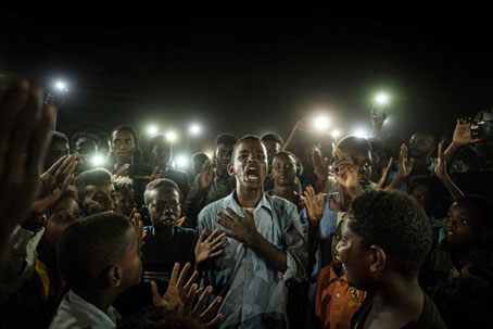 poema de protestaen medio de manifestantes que lo iluminan con sus celulares en Jartum, Sudán. El carácter