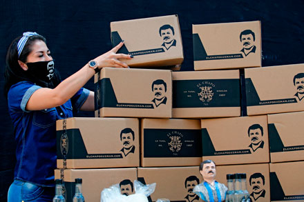 ▲ La reciente distribución de despensas en Guadalajara por la marca El Chapo 701 fue el preámbulo a la presentación oficial de la Fundación Alejandrina Guzmán, hija del narcotraficante Joaquín El Chapo Guzmán Loera. Los recursos para dar las ayudas provinieron de Don Archi SA de CV, afirmó personal de la empresa, que descartó que los apoyos vengan del narcotráfico. En la imagen, una empleada de la citada fundación usa un cubrebocas marcado con el rostro del capo mientras apila despensas para entregar a personas necesitadas debido a la emergencia sanitaria por el Covid-19, ayer en la capital de Jalisco. Foto Afp. / Notimex