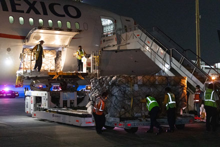 ▲ Anoche arribaron 962 cajas con 192 mil 400 caretas protectoras que serán distribuidas entre trabajadores del Instituto Mexicano del Seguro Social (IMSS). Los materiales cuentan con las certificaciones sanitarias internacionales y cumplen las normativas nacionales, informó la Presidencia de la República en un comunicado. En la imagen, descarga de los suministros médicos. Lo recibieron Zoé Robledo, titular del IMSS, y Martha Delgado, subsecretaria de Relaciones Exteriores. Foto Pablo Ramos. / Gergina Saldierna