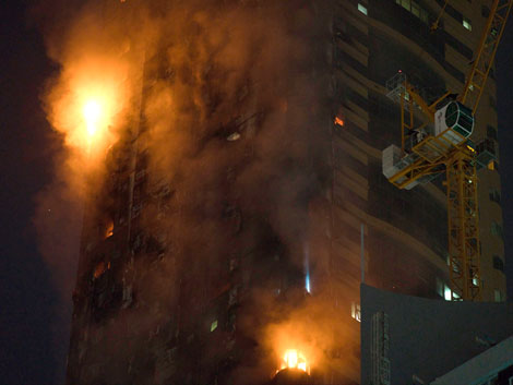 ▲ Las llamas ascendieron con rapidez por los costados de la Torre Abbco, de 48 pisos, en Sharjah. El fuego comenzó alrededor de las 9 de la noche y las autoridades informaron de siete personas con lesiones menores. En años recientes, la federación ha sufrido una serie de siniestros en sus rascacielos y, según expertos, se deben a materiales utilizados en revestimientos. Foto Ap. / Agencias