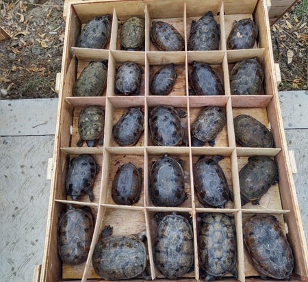 Los quelonios de agua dulce, los cuales están bajo protección especial en México, fueron descubiertos en 158 embalajes de madera, informó la Procuraduría Federal de Protección al Ambiente (Profepa). En comunicado, señaló que la incautación se realizó gracias a una inspección aduanera en materia de vida silvestre en la terminal capitalina, en la que no se acreditó la legalidad del traslado de los ejemplares, cuyo destino final era China. Foto Profepa.