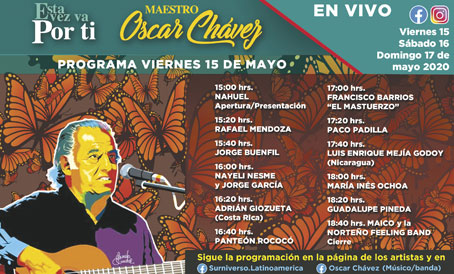 ▲ Diversos intérpretes, compositores, poetas y músicos participarán en el homenaje Esta vez va por ti, maestro Óscar Chávez, el cual se realizará de este viernes al domingo por Facebook e Instagram. El actor y cantante falleció el pasado 30 de abril víctima del coronavirus. Entre los participantes están: Panteón Rococó, Francisco Barrios El Mastuerzo, Luis Enrique Mejía Godoy, Guadalupe Pineda, Maico, Tania Libertad, Jaime López, David Haro, Gabino Palomares, Eugenia León y Guillermo Briseño. Ana Mónica Rodríguez