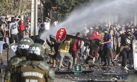 ▲ Centenares de pobladores de zonas pobres de Santiago, la capital, y de Valparaíso salieron a las calles luego de que la noche del domingo el presidente Sebastián Piñera prometió distribuir despensas, pero sin precisar fecha. Los inconformes levantaron barricadas y enfrentaron a la policía, que los reprimió con cañones de agua y gases lacrimógenos; se reportaron detenciones. La situación se ha vuelto crítica por la emergencia desatada por la pandemia del coronavirus. Foto Ap. Aldo Anfossi, Especial Para La Jornada